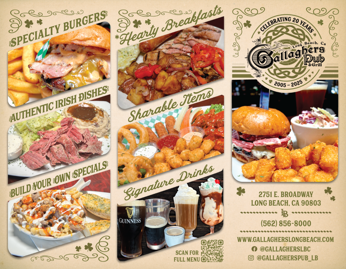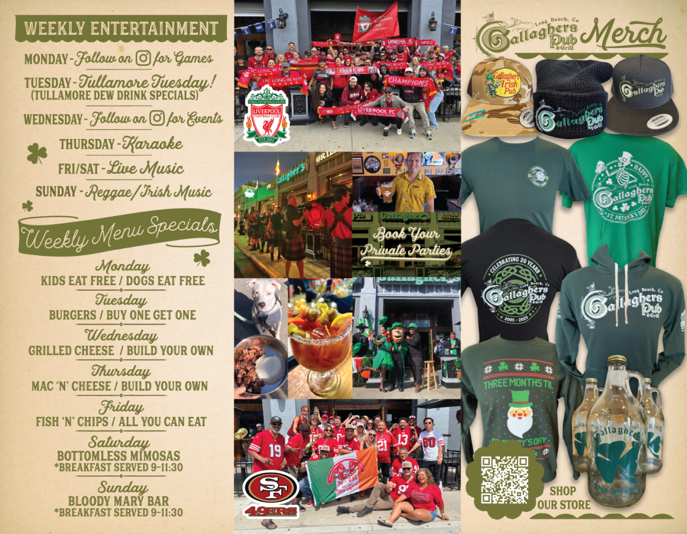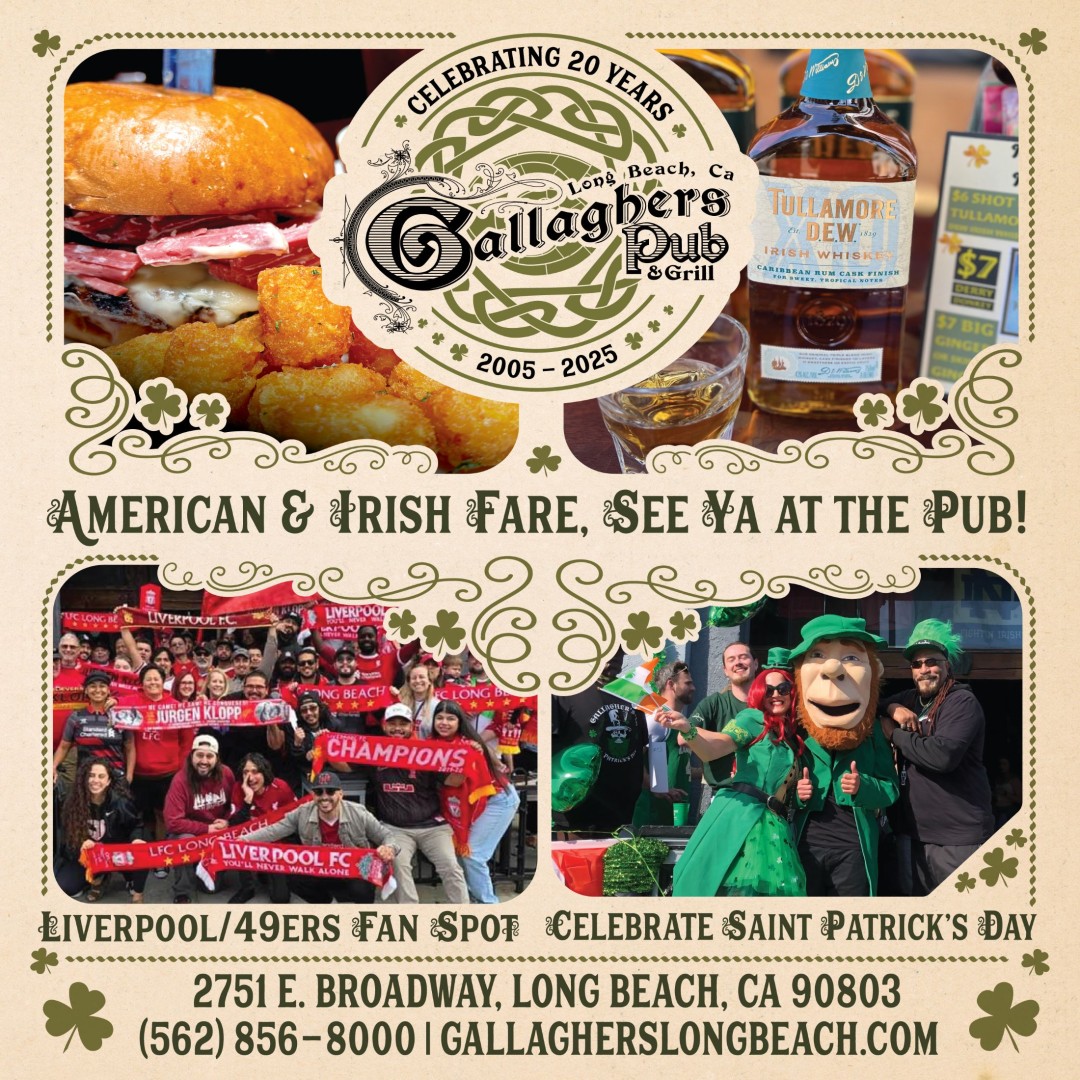 With fresh new faces. Gallagher's Pub & Grill Long Beach is the place to be. At Gallagher's the conversation and friendly humor flows as freely as a river of stout. It's the place where you can wet your whistle with a frosty beverage and sooth your appetite with good grub. We are the premier spot for viewing sporting events especially football matches, NFL, NBA, MLB, and NHL. We are an official San Francisco 49ers booster and Liverpool Football Club hangout. State of the art sound system and viewing monitors throughout the venue. Every seat is a good seat with your mates, slainte!