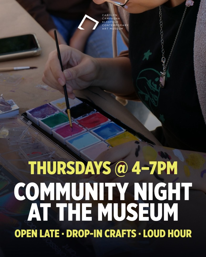 Visit the Kleefeld Contemporary Art Museum after hours every Thursday. Enjoy the Museum after hours and create art inspired by our current exhibitions in our Education Lab! We offer a free unguided art activity from 4:00pm to 7:00pm, and we also have LOUD HOUR from 4:00pm to 5:00pm! Tambourines, kazoos, and earplugs are provided to help you get loud in the galleries.