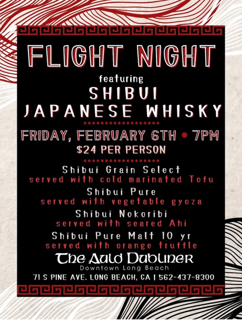 The Auld Dubliner will host a guided whiskey tasting featuring Shibui Japanese Whiskey, pairing a flight of four spirits with small bites.