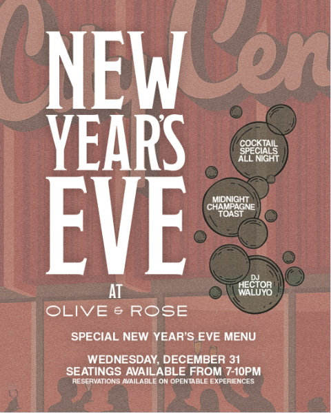 We will be offering a special New Year's Eve menu for the night with seatings available from 7 to 10 pm. After 10 pm, stay to enjoy drinks and the DJ in our courtyard as we countdown to the new year with a midnight toast.
