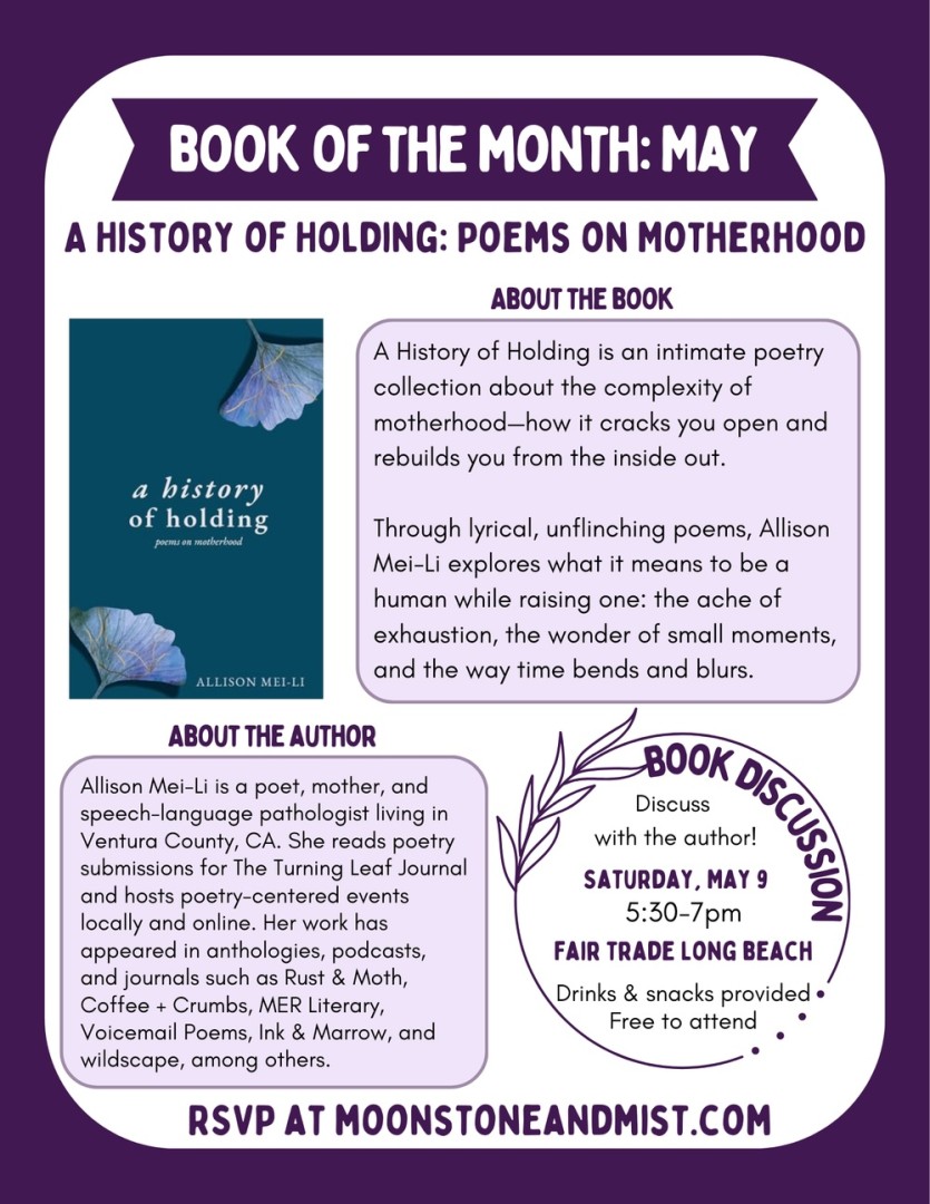 The May 9 event is part of Moonstone & Mist’s ongoing Book of the Month series, which highlights local authors and fosters community-centered literary gatherings in Southern California.