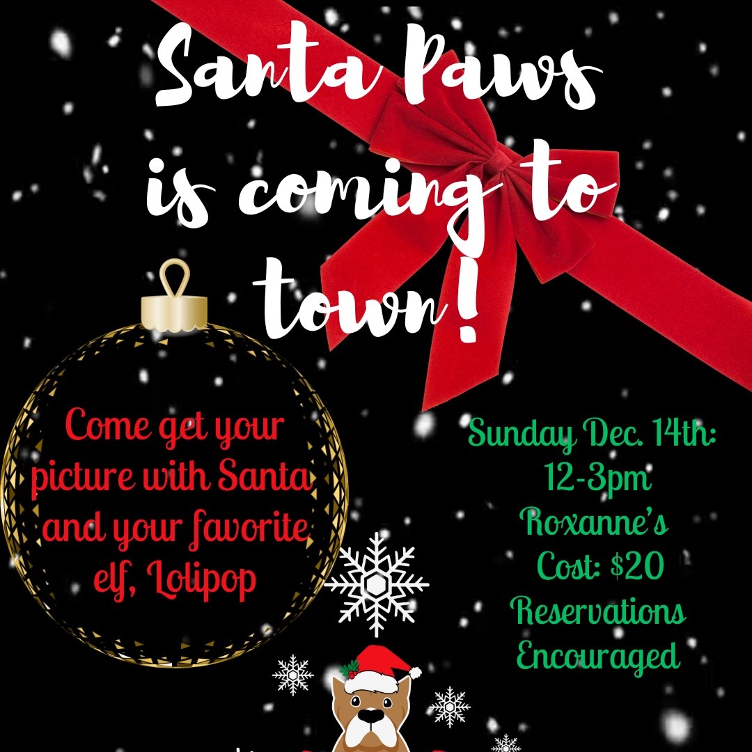 Santa Paws is Coming to Town! Get your picture taken with Santa and his favorite elf, Lolipop, along with your pet.