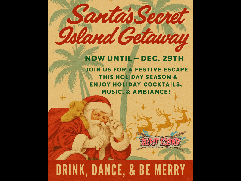 Escape to Santa’s Secret Island Getaway, where holiday cheer meets tropical paradise. Sip festive tiki cocktails surrounded by island décor, with holiday music and movies setting the perfect vibe. It’s the ultimate seasonal escape, right in the heart of Long Beach.
